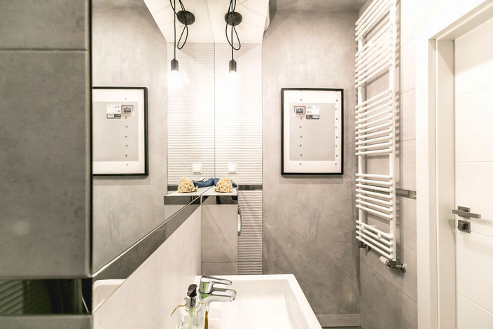 Sofa z funkcją spania, duża szafa, TV LED smart TV (Netflix), stolik, biurko, stół jadalniany + 3 krzesła, ozdobny beton na ścianach.