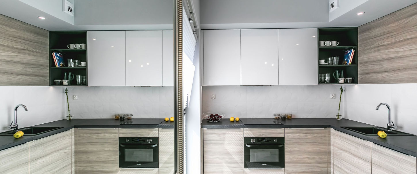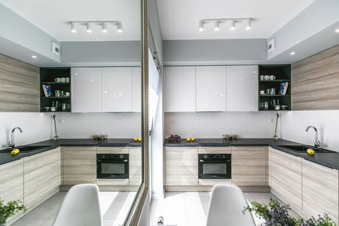 Meble na wymiar. Zmywarka i lodówka w zabudowie, kuchenka indukcyjna, piekarnik z funkcją mikrofal, wyciąg podszafkowy, czajnik elektryczny Tefal, garnki do kuchenki indukcyjnej, zlewozmywak granitowy, wbudowany dozownik na płyn do mycia naczyń.