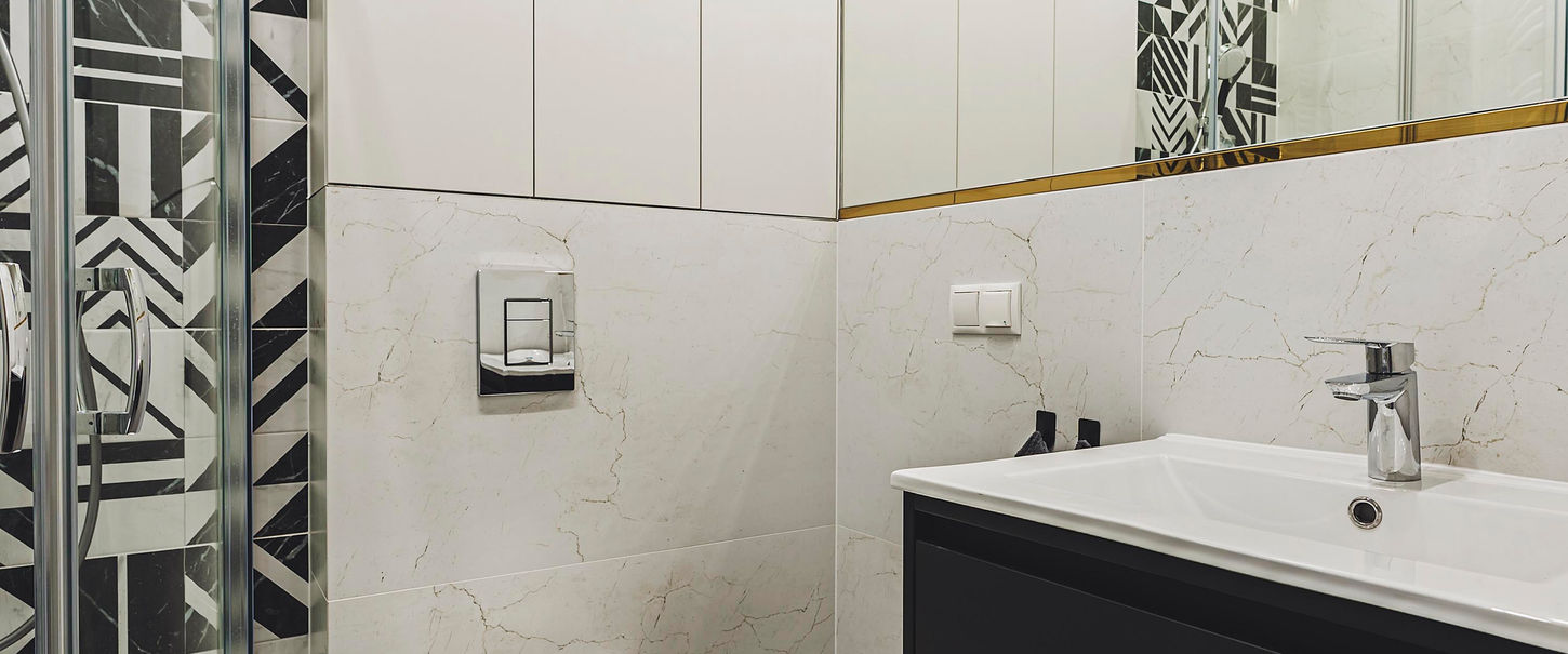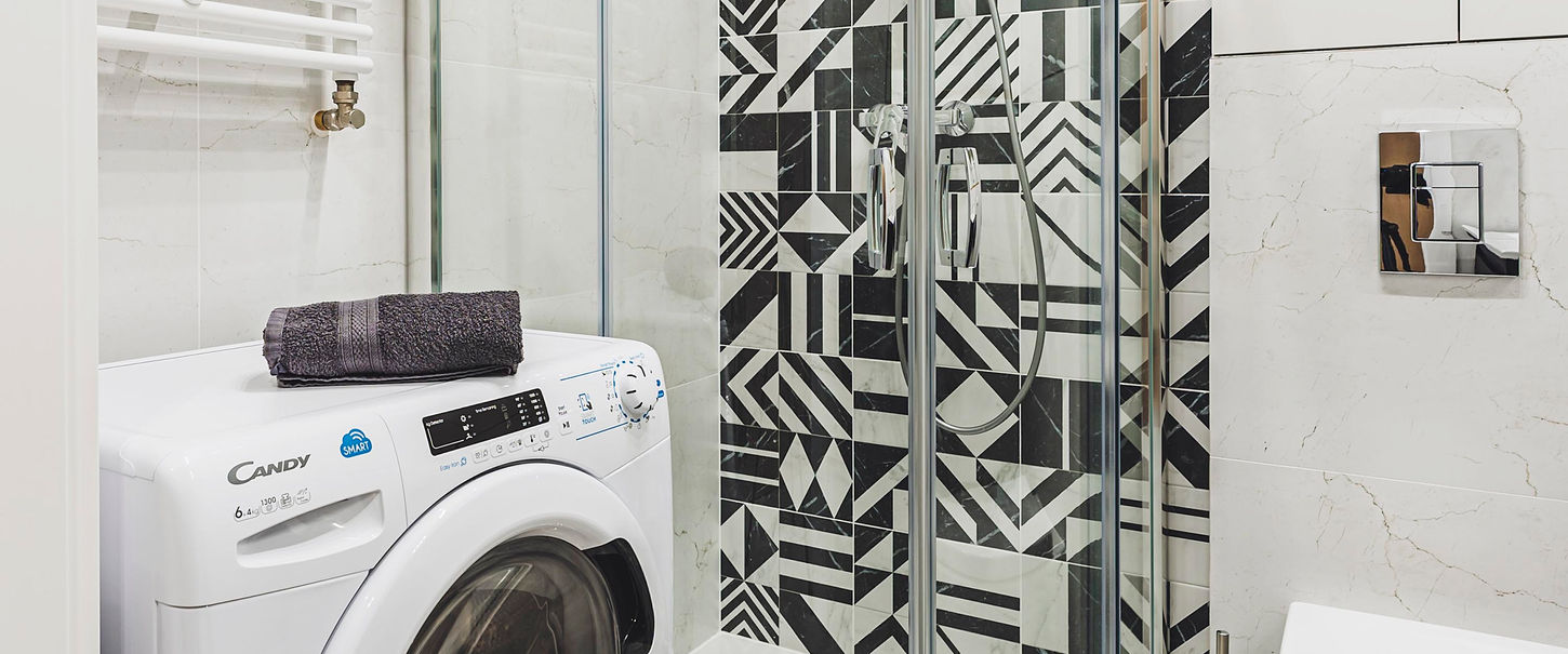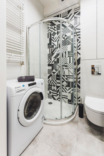 Prysznic, umywalka z szafką, nowoczesna pralko-suszarka.