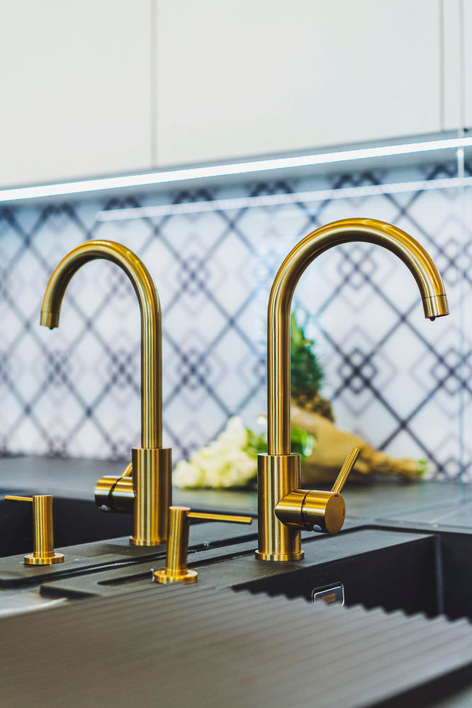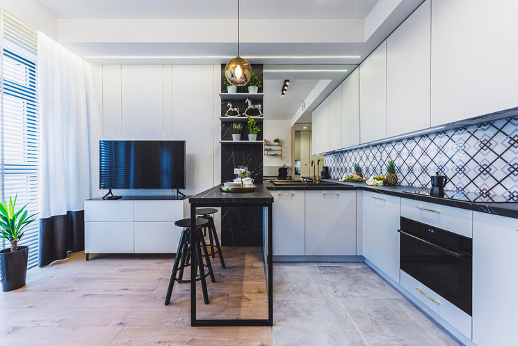 Meble na wymiar. Zmywarka i lodówka w zabudowie, kuchenka indukcyjna, piekarnik z funkcją mikrofal, wyciąg podszafkowy, czajnik elektryczny, garnki do kuchenki indukcyjnej, zlewozmywak granitowy, wbudowany dozownik na płyn do mycia naczyń, zintegrowany stół jadalniany wraz z hokerami.
