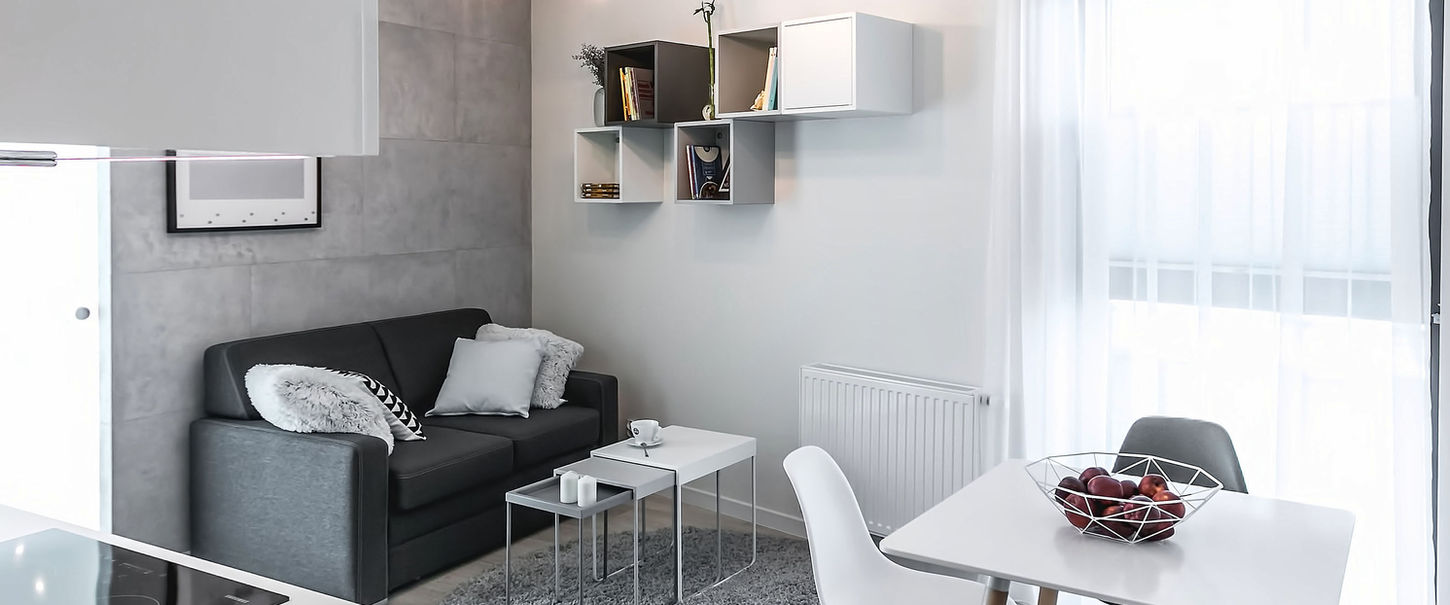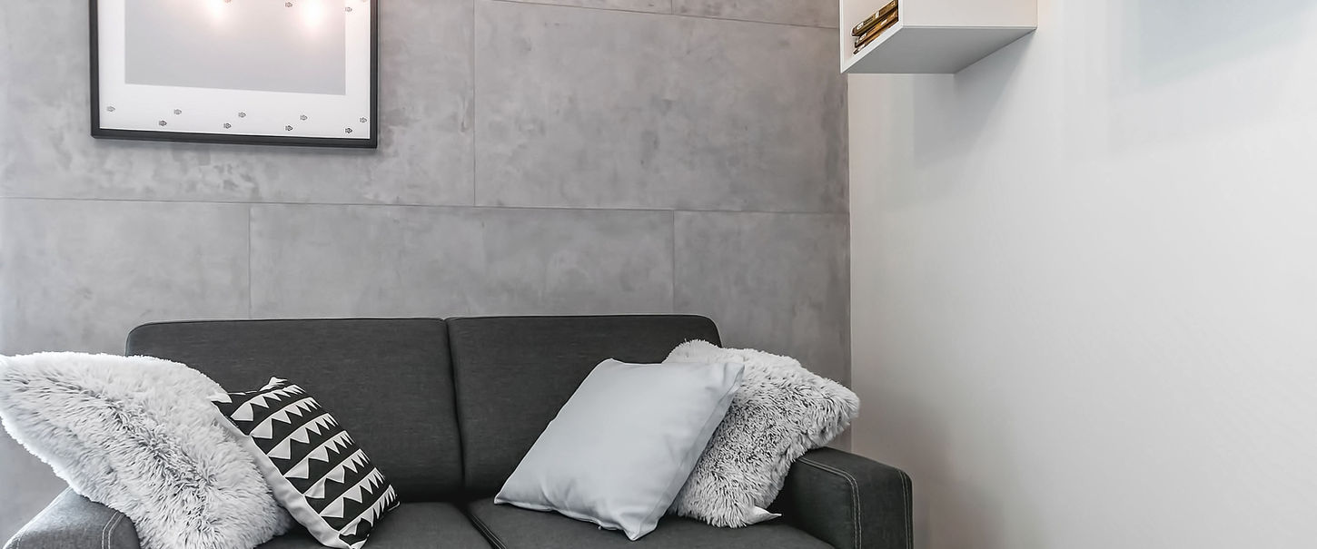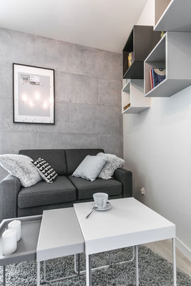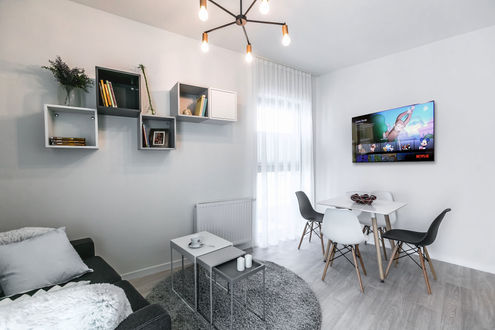 Sofa gościnna z funkcją spania, TV LED smart TV (Netflix), stolik, stół jadalniany + 2 krzesła. Beton na ścianach.