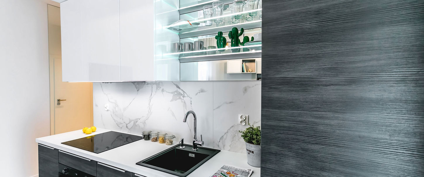 Meble na wymiar. Zmywarka i lodówka w zabudowie, kuchenka indukcyjna, piekarnik z funkcją mikrofal, wyciąg podszafkowy, czajnik elektryczny Tefal, garnki do kuchenki indukcyjnej, zlewozmywak granitowy, wbudowany dozownik na płyn do mycia naczyń.
